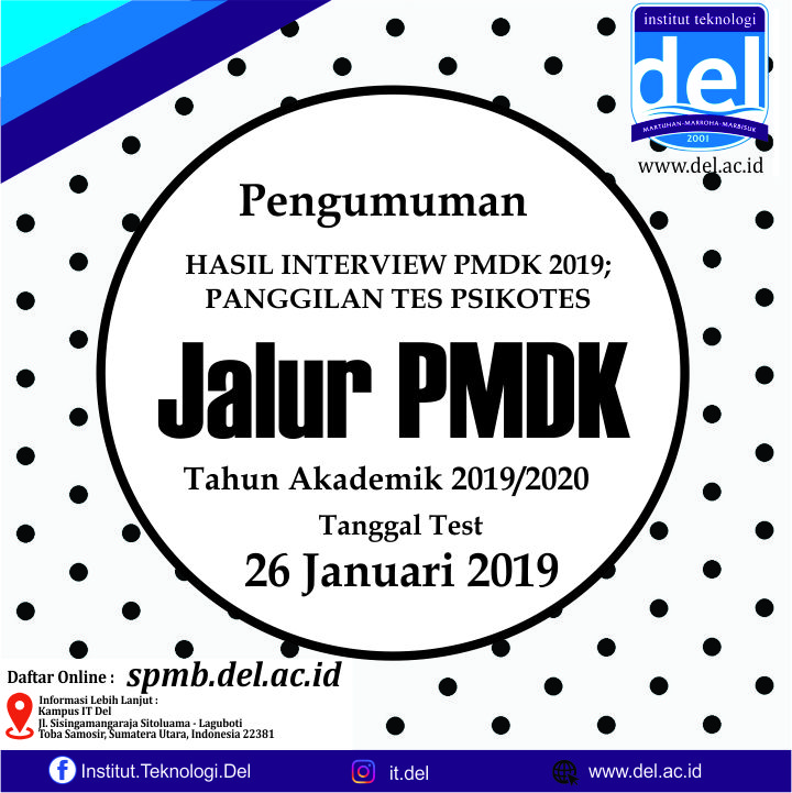 Bagi peserta Jalur PMDK Tahun 2019 yang tidak lulus dan dengan demikian namanya tidak tercantum di pengumuman ini memiliki kesempatan mengikuti USM Gelombang 1 IT Del yang dilaksanakan pada tanggal 9 Maret 2019. Pendaftaran USM Gelombang 1 dapat dilakukan melalui :